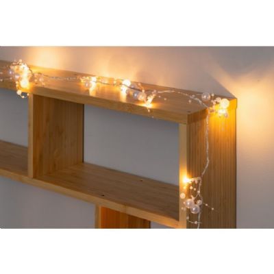 Batteridriven ljuskedja med pärldekorationer och 20 LED 3V 0,06W lampor som lyser varmvitt. Drivs med 3 st AA 1,5V batteri. (ingår EJ) och lyser upp till 60 timmar. Lamporna sitter på en 2 meter lång kabel med intervall mellan lamporna på 10 cm. 1 meter kabel till batteri.